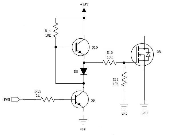 mos管的驅動電路介紹注意Q10的基極和D5的陰極直接相連Q10和Q9是輪流導通。PWM信號為正的時候,Q9導通,因為D5,Q10的基極電位比發射極電位