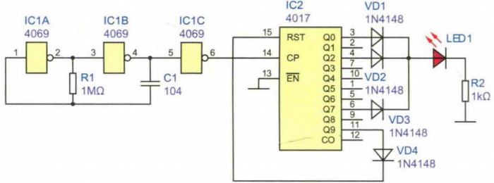 三閃信號燈電路方案設計介紹這是在一個循環周期內可以使LED閃爍3次,且3次閃爍間隔不等的電路。電路原理圖見下圖。圖中,由IC1A、IC1B與C1、R