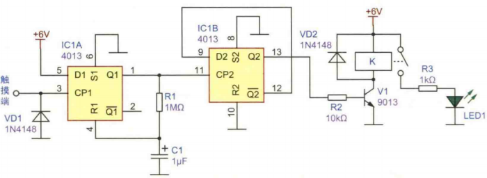 觸摸開關原理解析與電路設計介紹這是一個用4013組成的觸摸開關電路,只要用手觸摸一次開關即可接通,再觸摸一次開關斷開。電路原理圖見下圖所