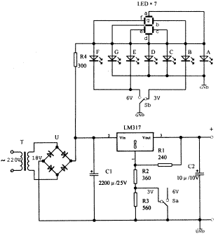 帶數字顯示的穩壓電源圖解用LM317可調集成穩壓器制作的穩壓電源,可以輸出多擋不同的電壓。假如這些多擋不同的輸出電壓值能用數字來指示該