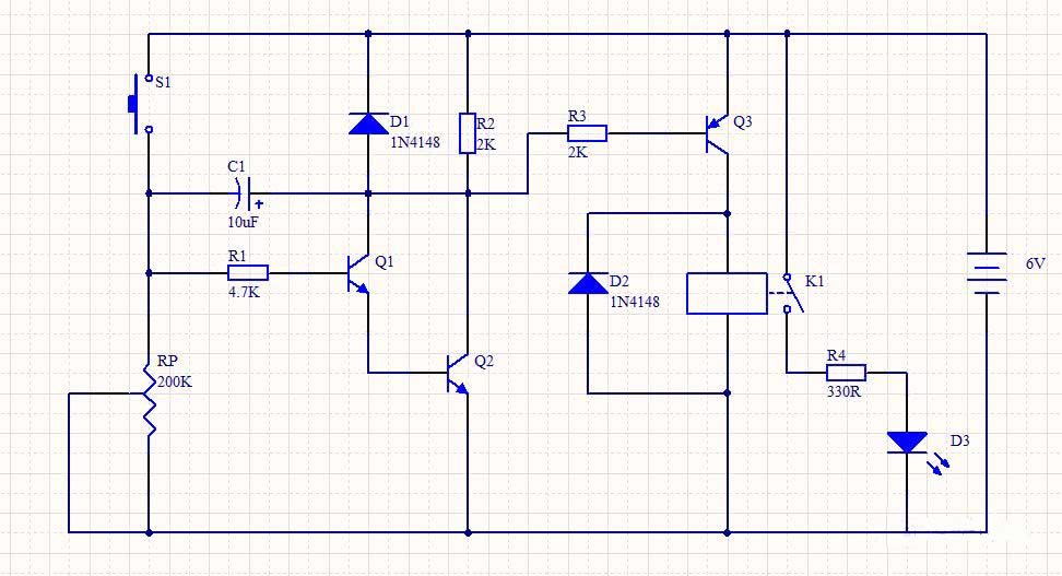 三極管開關延時電路圖解電路圖:電路功能分析:本例用三極管組成延時控制電路,控制繼電器的動作。當按鍵按下時,繼電器動作,延時一段時間