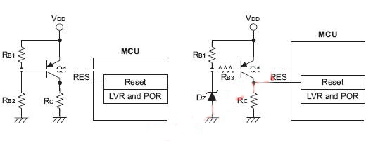 三極管低電壓復位電路圖當內建的低電壓復位電路的電壓與應用規格不同時,可選用外部三極管低電壓復位電路。可提供低電壓復位功能,并適用于