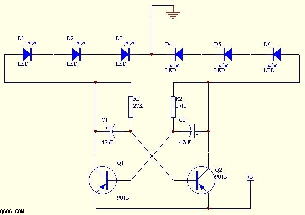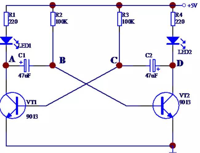 雙三極管驅動LED的多諧振蕩器原理解析雙三極管多諧振蕩器是一款應用較廣的常見電路形式,但對其原理描述卻不多見。附圖是一款雙三極管多諧
