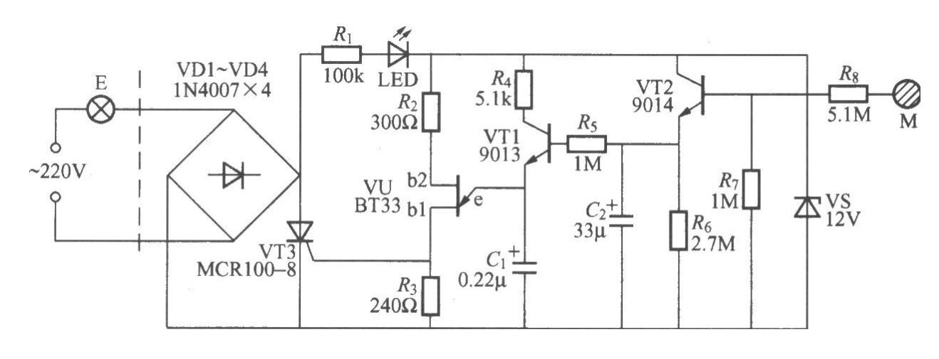 用基極三極管BT33制作的觸摸開關燈電路介紹BT33管腳排列圖觸摸式漸暗延遲燈電路本電路圖所用到的元器件:MMCR100-8 9013 9014 BT33觸摸