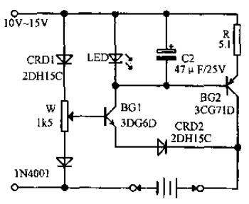 采用恒流二極管的恒流充電器介紹該恒流充電器使用了一只恒流二極管,電路見下圖:工作原理:充電開始時,電池電壓較低,三極管BG1基極電位