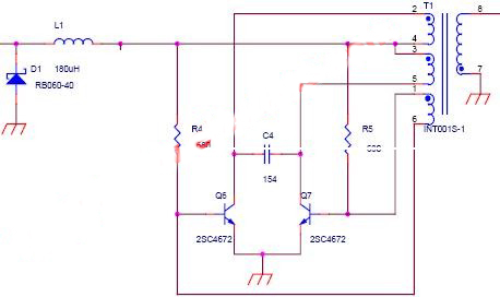 自激推挽式DCAC升壓變換電路圖解實際上是一個自激推挽式DCAC升壓變換電路,由續流二極管,阻尼電感,兩個PNP三極管,兩個基極電阻,一個諧振電容