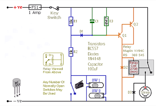 實用簡易的摩托車報警器電路圖介紹下圖是一個簡單、便宜且易于構建的摩托車報警器。該電路只需要2個晶體管來驅動繼電器,繼電器充當開關來