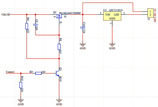 用PMOS實現LED恒流驅動芯片的通斷控制介紹電路原理:1、QX7135E33為330mA線性LED恒流驅動芯片,無使能端。2、利用PMOS控制QX7135的電源通斷
