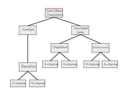 場效應晶體管-MOSFET類型與規格場效應晶體管類型有許多方法可以定義可用的不同類型的MOSFET。它們可以通過多種方式進行分類,但下面的樹形