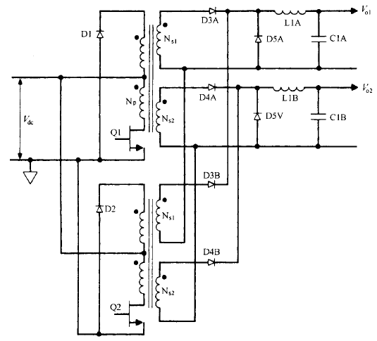 正激變換器拓撲的基本工作原理交錯正激變換器拓撲基本工作原理 、優缺陷和輸出功率限制這種拓撲只是兩個相同的單端正激變換器交替工作 (