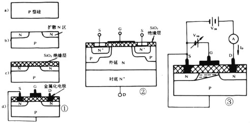 場效應管TMOS,VMOSMOSFET構造,從縱剖面來看,柵極(柵區)、源極(源區)、漏極(漏區)大致排列在同不斷線上,這樣的構造被稱為橫向溝道(