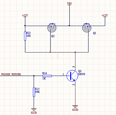 兩個PMOS背靠背用法詳解兩個PMOS并聯電路描述: Q3是三極管,Q1和Q2是PMOS管,左右兩邊的+12V是輸入,VIN是輸出,用來給模塊供電,PHONE_P