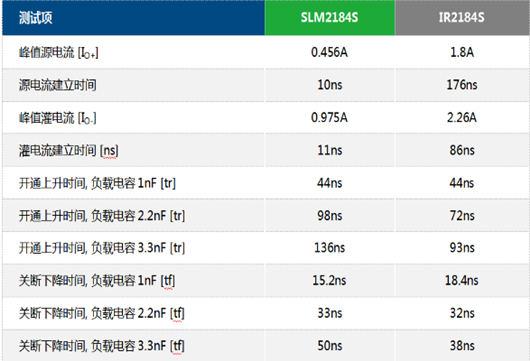 正確理解驅動電流和驅動速度詳解測試對比以下通過實測兩款芯片SLM2184S和IR2184S的性能來說明驅動電流建立時間對驅動速度的影響。表格1對比